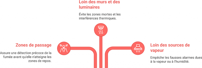 Le détecteur de fumée doit être fixé au plafond, car la fumée monte naturellement. Voici les zones à privilégier :